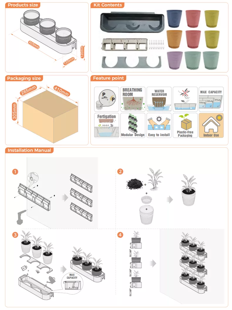 Anda boleh menanam tumbuhan atau sayur-sayuran kegemaran anda di dalam pasu bunga. Penyiraman juga sangat mudah. Anda hanya perlu menambah air atau larutan nutrien ke dalam periuk gantung simpanan air. Pasu bunga mempunyai reka bentuk berlubang di bahagian bawah, yang membolehkannya menyerap air dengan lebih baik.