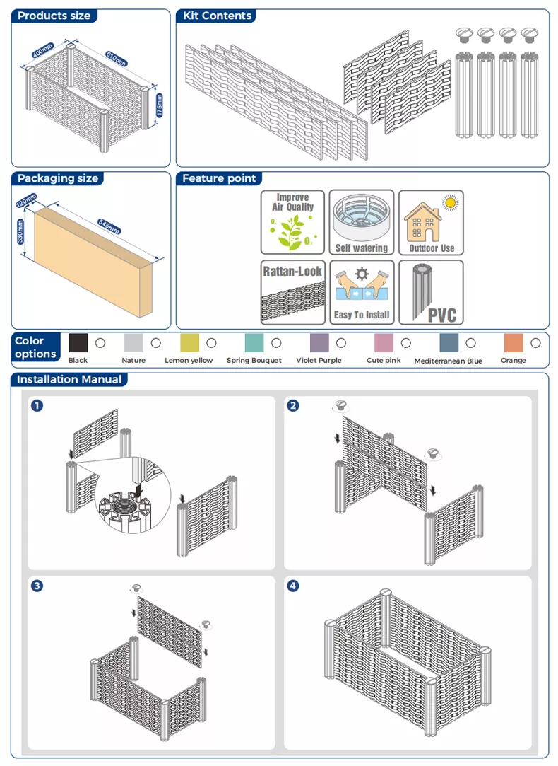 Setiap katil taman plastik immolrattan segi empat tepat dilengkapi dengan manual arahan pemasangan bergambar terperinci, menandakan dengan jelas langkah pemasangan dan langkah berjaga-jaga setiap komponen. Jika anda menghadapi sebarang soalan semasa proses pemasangan, anda boleh menghubungi kami pada bila-bila masa melalui perkhidmatan pelanggan dalam talian, talian hotline rasmi atau saluran lain, kami akan menyediakan panduan video atau teks satu-satu untuk memastikan anda menyelesaikan pemasangan dengan lancar.