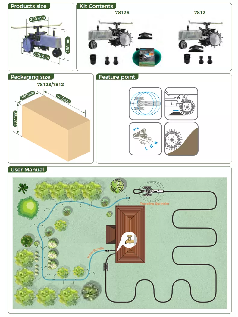 Salah satu sorotan utamanya ialah operasi bebas tangan automatik sepenuhnya. Hanya sambungkan hos taman dan tetapkan laluan, dan ia akan menyiram sepanjang laluan dengan sendirinya. Selepas pengairan selesai, ia secara automatik akan berhenti pada kedudukan pratetap tanpa memerlukan penyeliaan manual sepanjang proses, walaupun tanpa pengalaman berkebun, seseorang boleh dengan cepat memahaminya, mengurangkan intensiti buruh kerja pengairan.