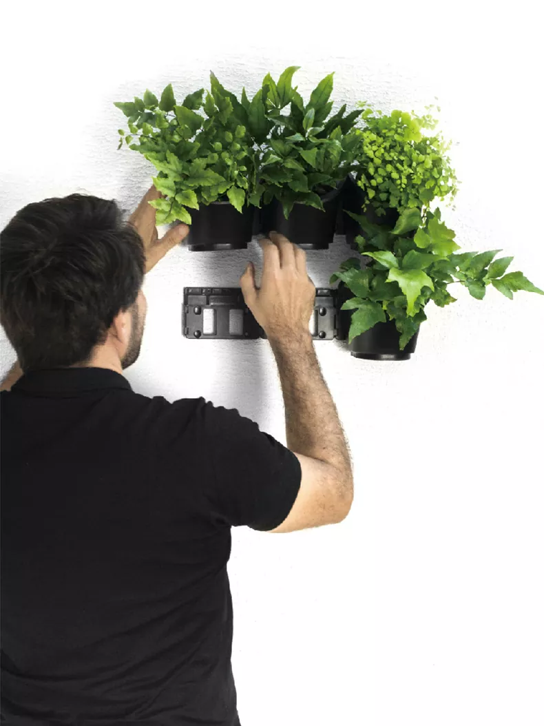 Jalur gantung saiz yang berbeza dan periuk gantung yang sesuai agak mudah untuk mencipta dinding hijau dalaman atau luaran.